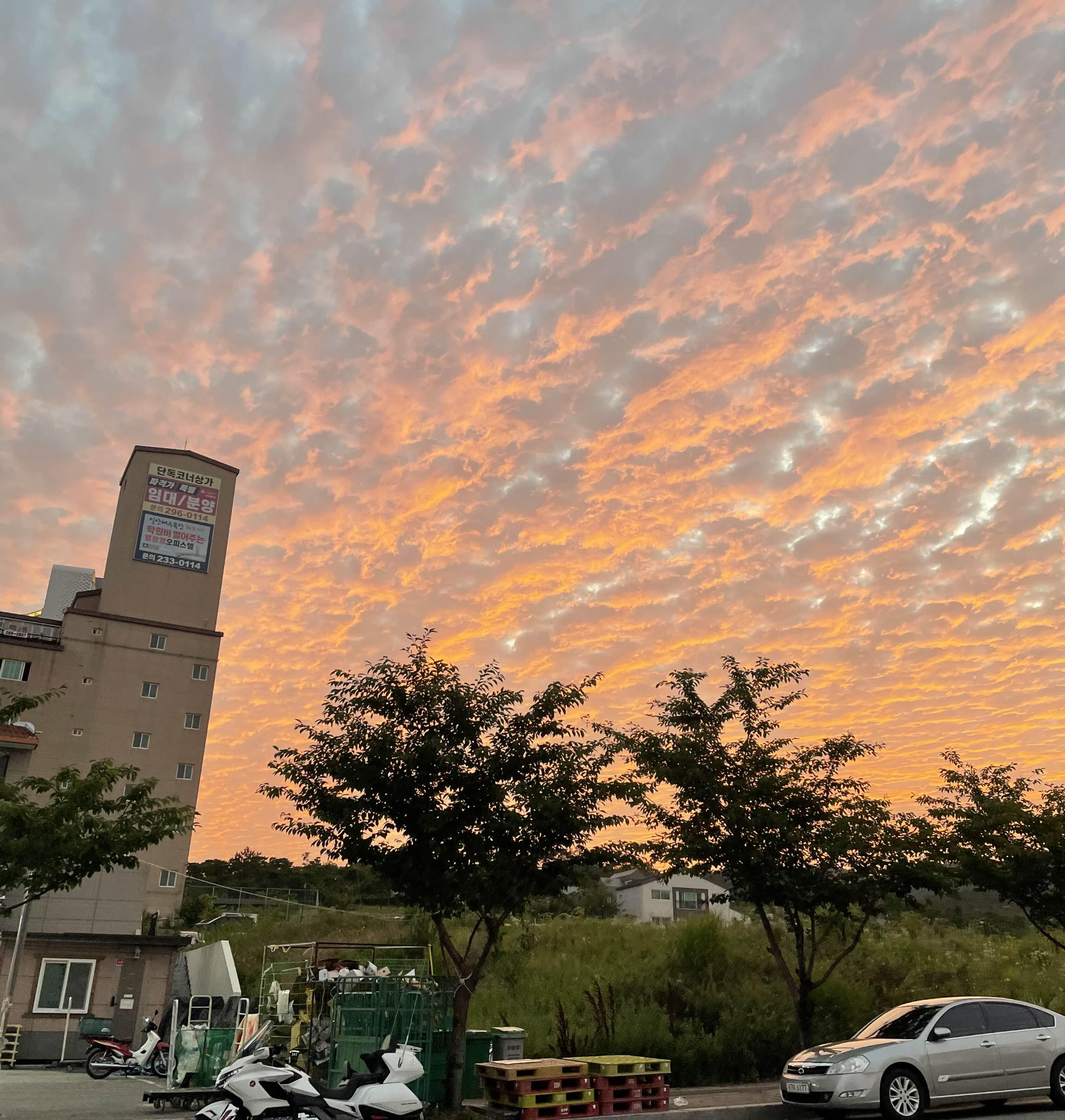 동해안 오션뷰 숙소의 가장 좋은 점은 방에서 일출을 볼수 있다는 건데 안타깝게도 아침에는 구름이 도와주지 않아 일출을 보는것은 실패했다. 그래도 붉게 물든 하늘이 참 예쁘다.