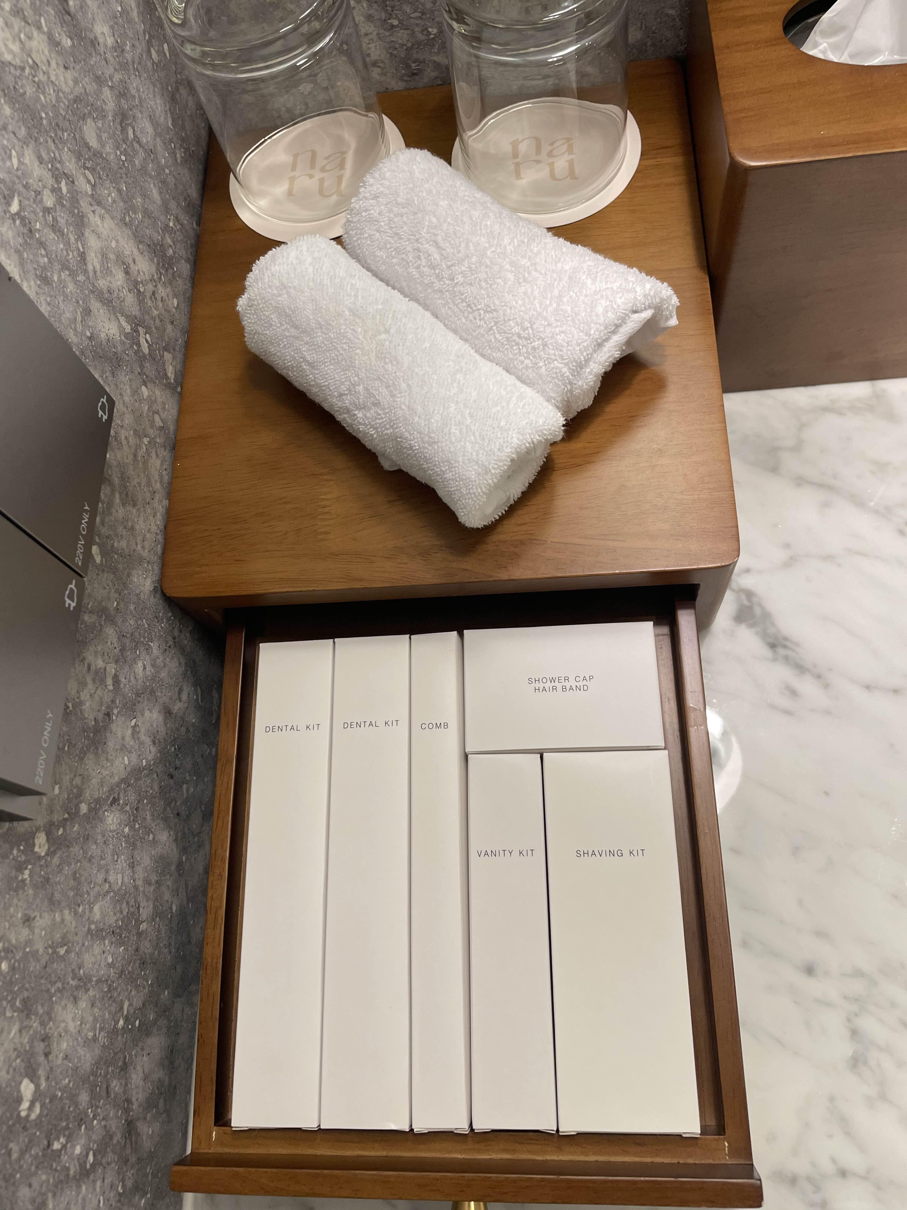 세면대 위에는 손닦는 수건과 양치컵, 그리고 일회용품들이 놓여있다.