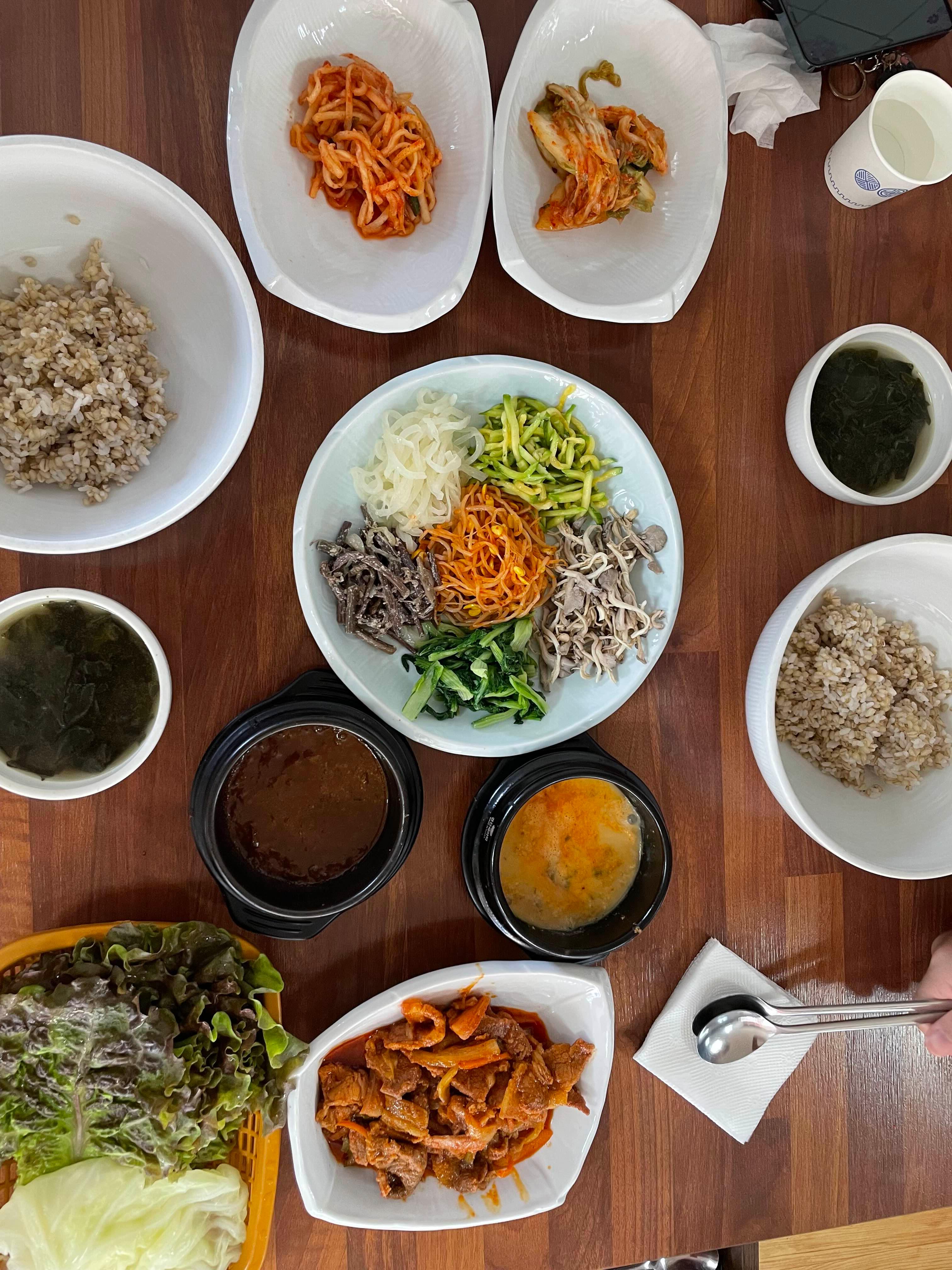 비빔밥으로 먹을수 있도록 여러가지 나물과 미역국, 김치, 강된장, 쌈채소, 제육볶음 등이 푸짐하게 제공된다.