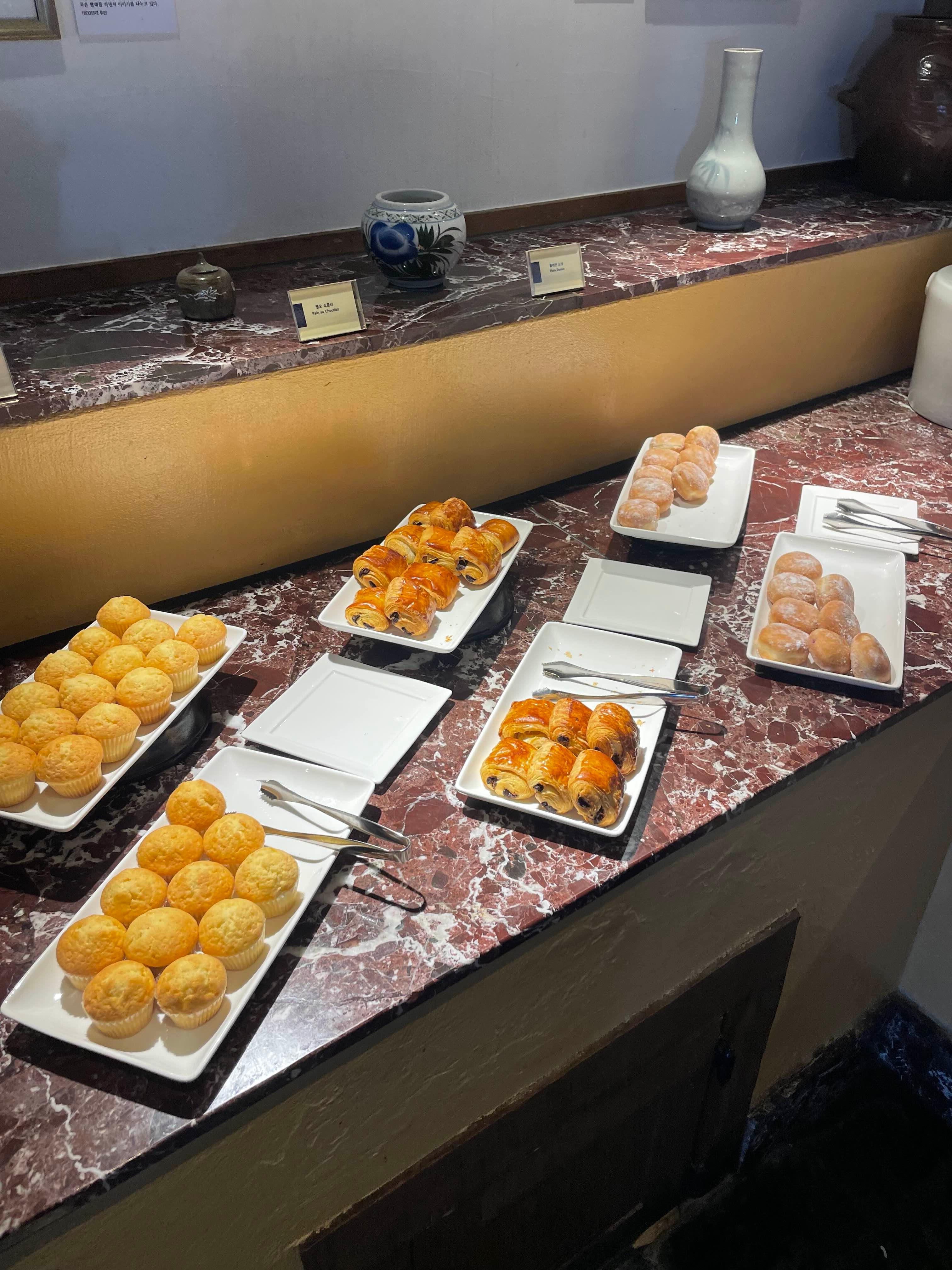 애프터눈티타임, 머핀과 도넛 등의 베이커리류 몇가지와 쿠키, 크로와상 등도 있고