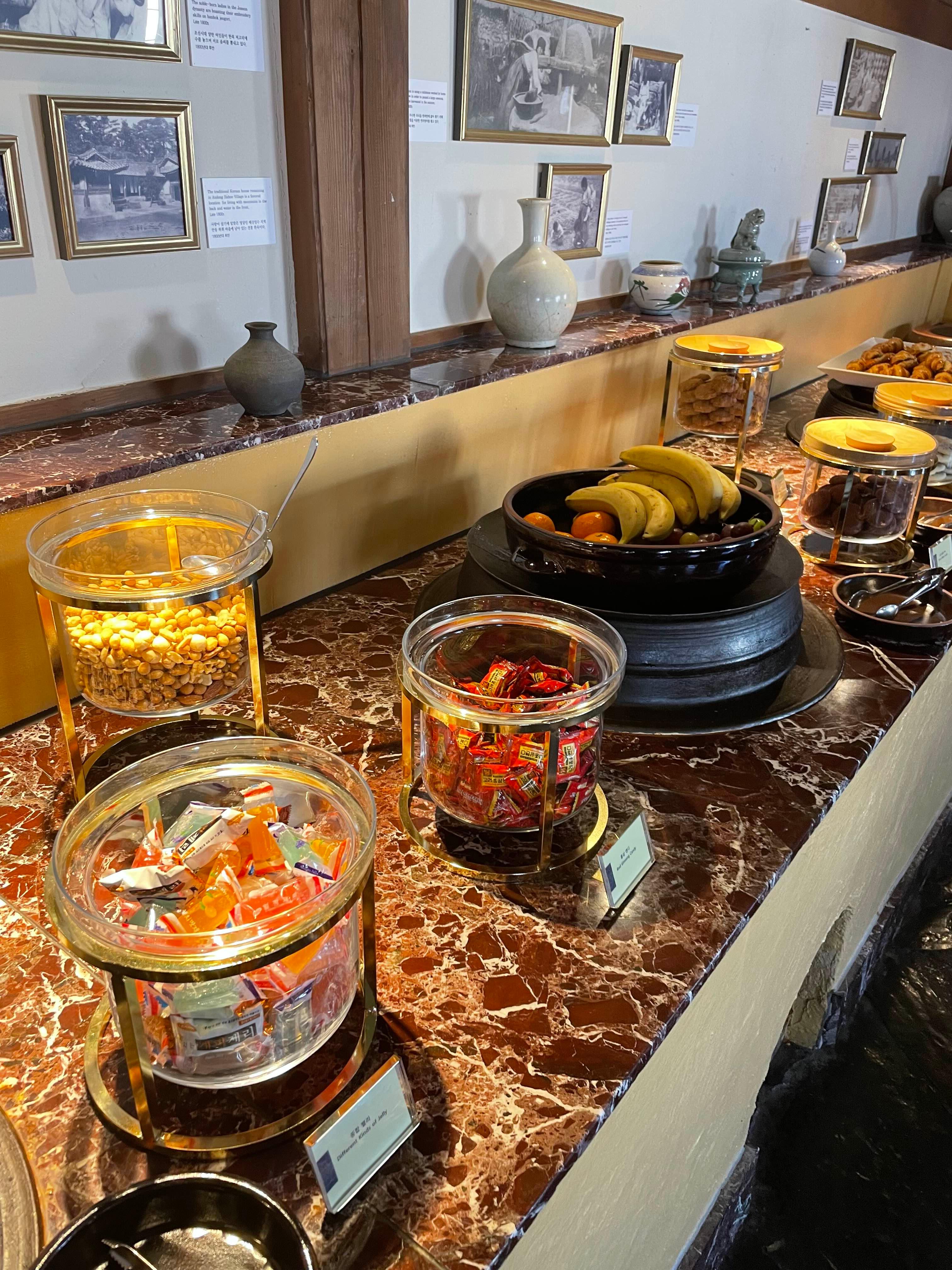해피아워 타임에 세팅될 핫푸드 자리에는 도자기와 항아리 같은 물품들과 오래된 한국의 사진들이 전시되어 있다.
